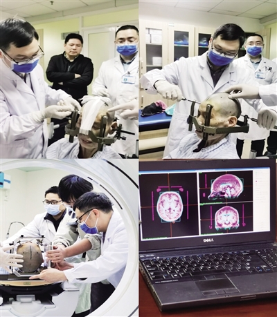 经过测算确定了手术位置坐标,将手术坐标与患者头部定位支架核对确定后,专家团队在患者头部两侧分别切开了一道约3厘米的切口,并在颅骨打孔,固定好电极基环,最后将刺激电极缓缓植入大脑内丘脑底核处。