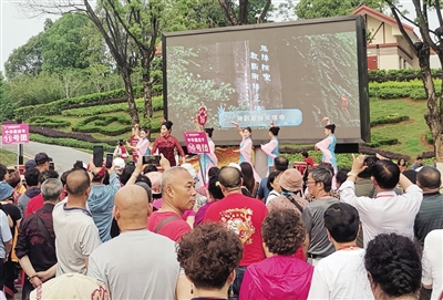 下午5时许,雁峰区在广场上举办了简短而又隆重的欢迎仪式。舞台上是一曲精彩绝伦的《雁翔蓝天》弹词表演,大屏幕上则穿插着雁峰美景。雁峰,有着衡阳市区湿地面积最大的公园——南湖公园,有八百里南岳衡山七十二峰之首的回雁峰,有与岳阳君山、长沙橘子洲头并称湘江流域3大洲岛的东洲岛,有生动呈现湘南建党奋斗历程的衡阳党史馆……雁峰区委常委、区委办主任洪流热情洋溢地登台致辞,欢迎嘉宾,推介雁峰美景和美食。雁峰区还为千人团中50余名寿星集体过生日,送上了雁峰特色伴手礼——古汉养生精礼盒。