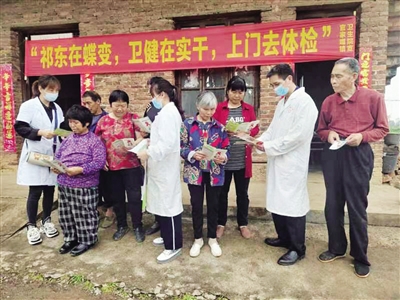 4月24日,祁东县卫生健康局组织官家嘴镇卫生院党员和医务人员志愿服务队深入泉陂村,开展上门服务和健康宣教,为65岁以上老人送医送药送健康。
