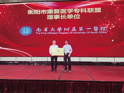会议宣布了衡阳市康复医学专科联盟平台的成立,并授牌南华附一医院为联盟理事长单位,南华附二医院、南华医院、市中心医院、市第一人民医院、市中医医院为副理事长单位,南华附三医院等5家医院为常务理事单位,还为83家衡阳市康复医学专科联盟会员单位授牌。市康复医学专科联盟的成立,将进一步加强各兄弟单位的交流与融合。