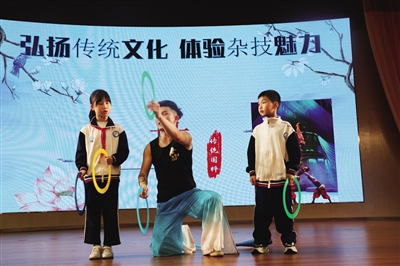 日前,本报小记者俱乐部组织的“传统杂技进校园”活动走进高新成章实验学校雁鸣溪小学,图为该校小记者参与互动体验。 ■李境 摄