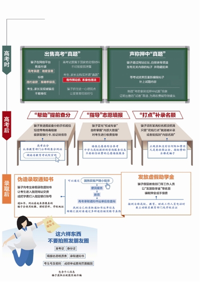 高考前后,一些骗子利用考生和家长“想上好大学”的愿望,散布谣言、制造焦虑、实施诈骗。高考前、高考时、高考后以及录取后都是骗子的活跃期,考生和家长要提高警惕。