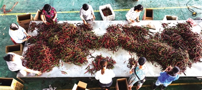 8月4日,常宁市洋泉镇新瓦村湖南椒八方农业发展有限公司的300余亩辣椒迎来收获季,村民们忙着采摘、分拣、装车,一派喜人的丰收景象。近年来,常宁市洋泉镇新瓦村积极调整农业产业结构,采取“公司+农户+市场”的模式,结合市场需求种植特色辣椒品种,带动当地农民增收致富。 ■郭宜庚 摄