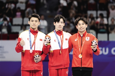 8月4日,冠军中国选手张博恒(中)、亚军中国选手侍聪(左)和季军日本选手萱和磨在颁奖台上合影。当日,在成都举行的第31届世界大学生夏季运动会体操项目男子个人全能决赛中,中国选手张博恒以86.733分的总成绩获得冠军。 ■新华社发