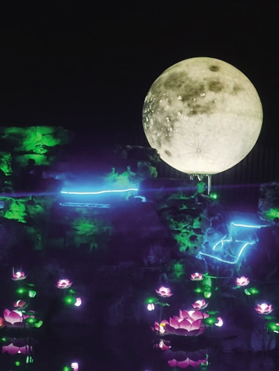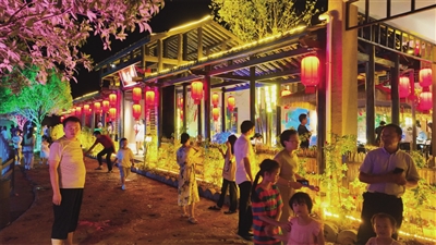 在夜幕降临时,荷花里变得更加迷人。流光飞舞的彩灯装点着整个山村,灯火摇曳,散发着温馨的氛围。悠扬的音乐在空气中弥漫,各种美味佳肴香气四溢。每天都有上千名游客前来欣赏夜晚的盛宴,他们或在凉亭中闲坐聊天,或漫步在荷花田间,抑或欣赏茶艺表演,让人心旷神怡。