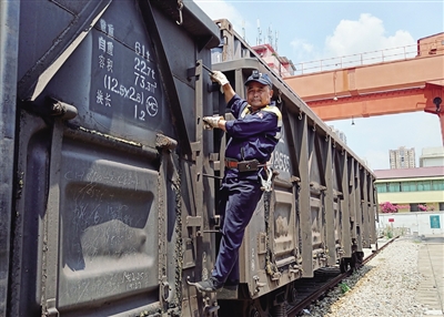“在烈日的炙烤下,钢轨温度往往会超过50℃,车体铁皮表面温度至少达到60℃。为了随时掌握机车和股道情况,我们调车过程中必须一直‘挂’在火车上,有时候身体紧挨着车体,有点‘人肉铁板烧’的感觉。”邹剑锋说。