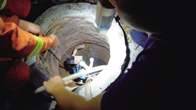经现场侦查,消防救援人员发现一名成年男子和一名男孩被困水井下,无法动弹。由于井水有六七米深,大人只有紧紧抱着小孩,双脚蹬着水井两侧,以免落入水中。