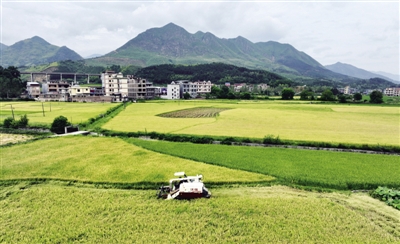 时下,常宁市的中稻陆续进入成熟收割季,田野里一片金黄,当地农民抢抓农时忙收获,一派喜人的丰收景象。近年来,常宁市全面推进土地综合整治,改造提升高标准农田,打造集粮食产加销、农文旅、产学研多功能为一体的粮油全产业链,稳步提升粮食综合生产能力。■周秀鱼春 摄