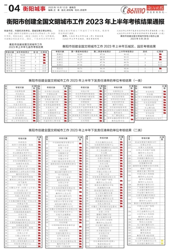 衡阳市创建全国文明城市工作 2023 年上半年下发责任清单的单位考核结果(二类)