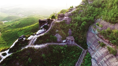 来到耒阳唯一的“丹霞地貌”——寨下仙,远望似绚丽红霞,近看则色彩斑斓。几座险峰,悬崖峭壁,刀劈斧削,气势雄伟;山间怪石耸立,似大象、如雄鹰、若虎豹,千奇百怪,形态逼真。石壁上花纹密布,犹如神笔马良留下的彩绘,又若敦煌飞天的飘飘裙裾,线条清晰优美,令人叹为观止。