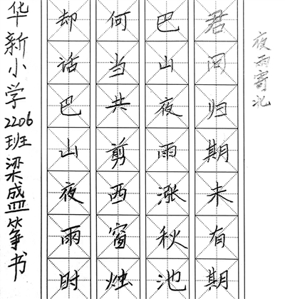 《夜雨寄北》 高新区华新小学 二(6)班 梁盛筝 书法作品 指导老师:唐 彬