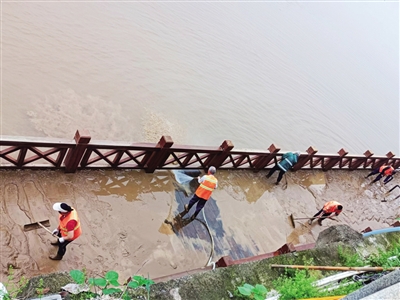 洪水退去,石鼓书院景区沙滩及木栈道上留下大量淤泥。记者在现场看到,志愿者正挥动铁锹铲除淤泥,清理杂草等杂物垃圾,冲洗临湘江一侧的木栈道,临水危险区域仍设置了警戒线等安全警示标志,提醒过往市民游客注意安全。景区方相关负责人介绍,今年入汛以来的首轮洪水并未漫涌至石鼓旱桥桥面,对石鼓书院的对外开放游览未造成影响,临水木栈道及石鼓沙滩被淤泥覆盖,淤泥最深处厚度约5厘米,含沙量较大,清理起来较为困难。为了防范山体滑坡等险情,景区方及时对临水水浸的危险区域进行了围挡,安全保卫人员实行全天候24小时巡逻值守。清洗后的木栈道及沙滩等区域将喷洒消毒剂,开展卫生防疫消毒处置。景区方表示,木栈道及沙滩淤泥清理清洗作业将持续4天左右,将根据湘江城区段水位下降情况,力争尽快完成木栈道及沙滩垃圾杂物的清理清运等工作。